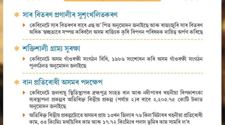 কেবিনেটে জলবায়ু স্থিতিস্থাপক ব্রহ্মপুত্র সংহত বান আৰু নদীপাৰৰ খহনীয়া বিপদাশংকা ব্যবস্থাপনা প্ৰকল্পৰ অতিৰিক্ত বিত্তীয় প্রকল্প (পর্যায় ২)ৰ বাবে ২,২০৫.৭৫ কোটি টকাত অনুমোদন জনাইছে