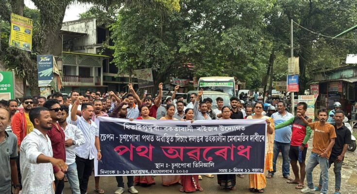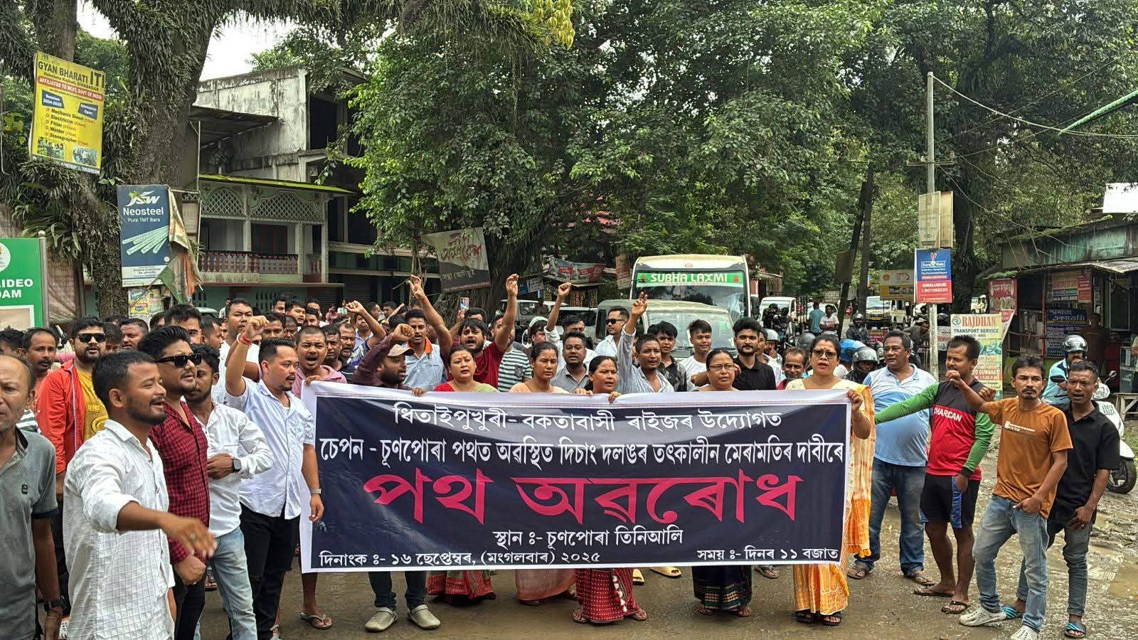 চেপন সংযোগী পথ বন্ধ কৰি দিলে ধিতাইপুখুৰী, বকতাবাসী ৰাইজে -চুণপোৰাত আৱদ্ধ হৈ পৰিছে শতাধিক যান- বাহন পথটেই আৱদ্ধ হৈ পৰে ৷